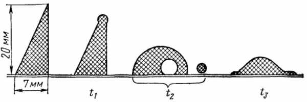 В процессе постепенного нагревания пирамид в электрической печи отмечают три точки (рис. 8): температуру начала деформации t1, определяемую в начале плавления верхушки пирамиды; темпера туру размягчения t2, которая фиксируется в момент, когда верхушка пирамиды наклонится до основания или же пирамида превратится в шар, и температуру t3, когда содержимое пирамиды растечется по основанию.