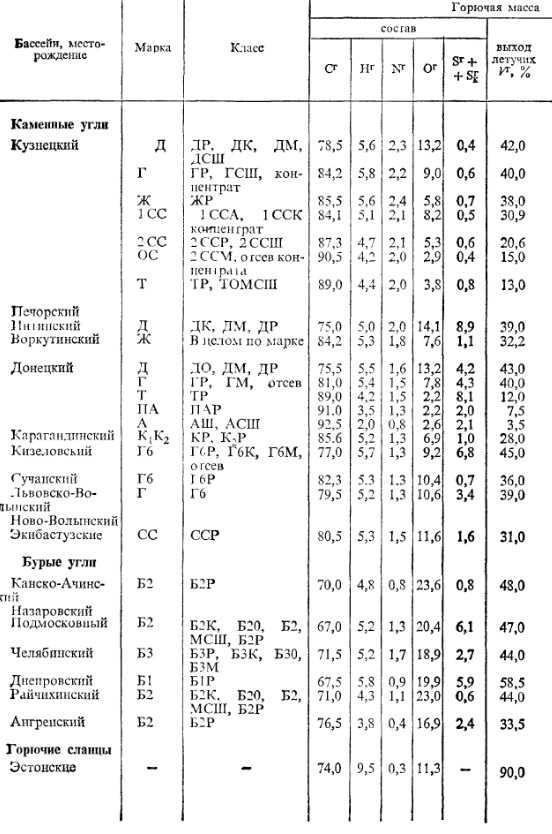 К ним относят угли с выходом летучих на горючую массу Vr = 2 - 9% и теплотой сгорания горючей массы Qpн = 24,35 - 27,24 МДж/кг (5800-6500 ккал/кг). Переходным между каменными углями и антрацитом является полу антрацит. Антрацит и полуантрацит не самовозгораются. Характеристика твердого топлива энергетического назначения приведена в табл. 9.Марки углей отличаются одна от другой выходом летучих и степенью спекаем ости. Различают следующие марки углей: Д (длиннопламенные), Г (газовые), Ж (жирные), КЖ (коксовые жирные), К (коксовые), С (отощенные спекающиеся), Т (тощие), СС (слабоспекающиеся). Все виды углей по размеру кусков делят на классы (табл. 10).Горючие сланцы являются продуктами разложения растительных остатков, оседавших на дне больших водоемов; смешиваясь с минеральными осадками, образовывалось илистое вещество - сапропель, которое обогащалось водородом, уплотнялось и превращалось в горючие сланцы.
