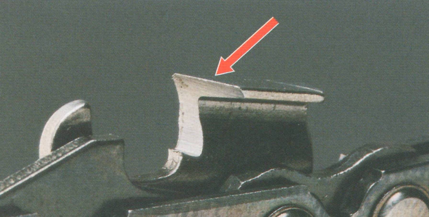 Его несложная конфигурация включает в себя две режущих кромки — боковую и скошенную верхнюю. Толщину снимаемой стружки определяет высота ограничителя. Чрезмерно низко срезанные упоры инициируют дополнительные нагрузки на двигатель, не исключается вероятность травмоопасного разрыва цепи.