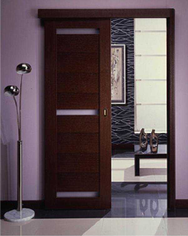 Эта разновидность отличается от подвесных дверей тем, что система с направляющими спрятана в толще стены. Соответственно, и дверное полотно будет уходить в стену, в своеобразную кассету, устроенную по размеру створки.