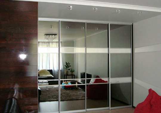Первая разновидность перегородок похожа на шторы. Система передвижения навесных дверей купе укрывается в декоративных панелях. Их изъяном является неплотное прилегание дверок к стене, что исключает звукоизоляцию помещения.