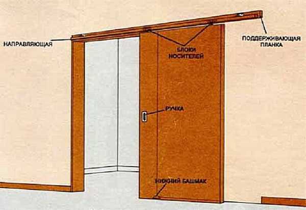 Такие двери подвешиваются на специальную конструкцию, которая закрепляется на потолок или на стены. Полотно двери ходит по направляющему рельсу. Крепежные и направляющие элементы могут быть открытыми или же их декорируют маскировочным коробом.