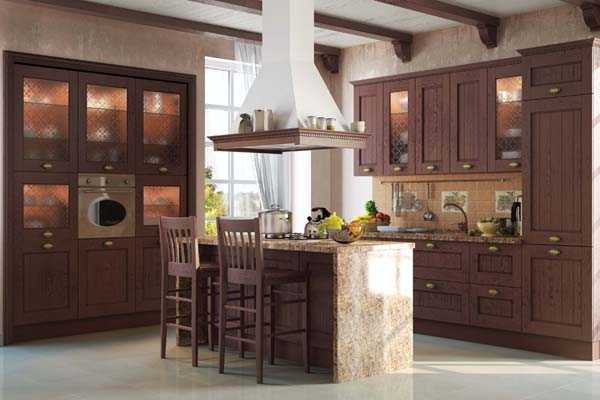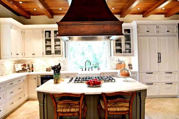 Габаритная островная конструкция вписывается в обстановку деревенского интерьераВытяжки для кухни с отводом в вентиляцию: особенности работы и устройство