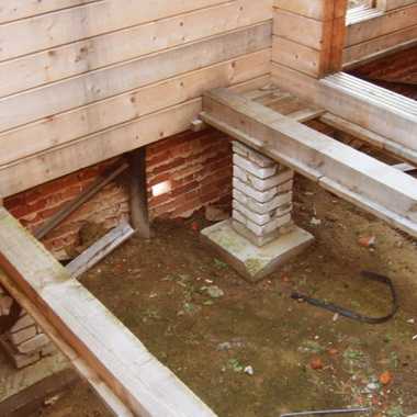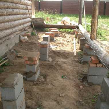 После установки столбиков для фундамента приступают к земляным работам. Под столбики выкапывают ямы глубиной 50 – 70 см, засыпают в них песок слоем в 15 – 20 см, увлажняют и утрамбовывают. Как только песок высохнет, насыпают щебень высотой в 10 см. Сверху на него льют жидкий битумный раствор для обеспечения столбам надежной гидроизоляции.Основание