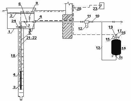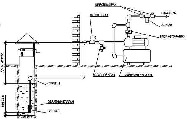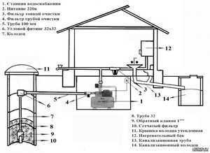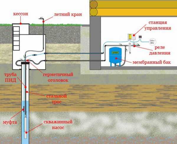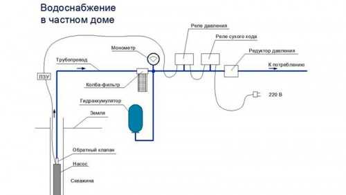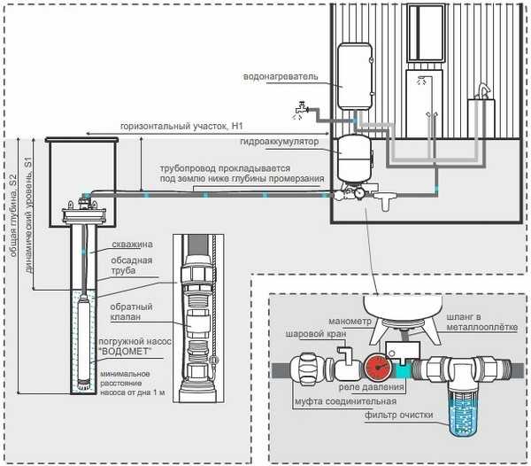 Схема монтажа системы водоснабжения из скважины с погружным насосомВодоснабжение частного дома из колодца и скважины, с накопительным баком, гидроаккумулятором, автономное, резервное, схемы