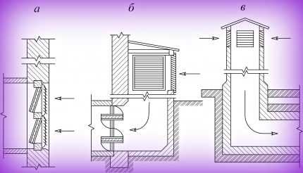 Схема расположения воздухоприемных устройств: в ограждающей конструкции (а)‚ возле наружной стены (б)‚ на кровле (в). Каналы для вытяжки и шахты утепляют снаружи‚ иначе зимой в них будет появляться наледь
