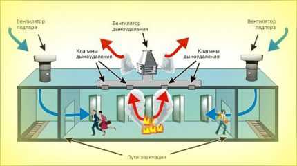 На фото — схема действия противодымной вентиляции. Ее монтируют в дополнение к основной вентиляции‚ чтобы гарантировать эвакуацию людей при возникновении пожара и отрезать пути расползания дыма