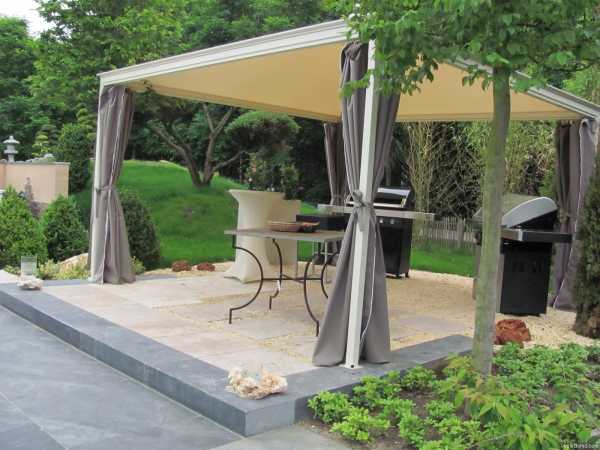 Данный вариант конструкции пришел с Запада, где часто используются подобные конструкции непосредственно у домов, расположенных в пригороде, но в достаточно плотной застройке, где сосед буквально может заглянуть за ограду, где газон, как обычно, зеленее. Чтобы этого не произошло, организуют патио – участок двора со стенами, но без крыши, в котором можно установить места для сидения, столики и, конечно, барбекю.