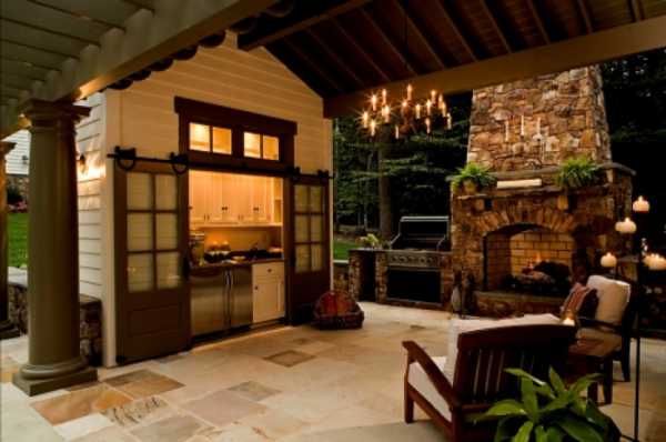 Второй вариант – установить очаг недалеко от террасы, чтобы свежеприготовленную ароматную пищу поглощать на свежем воздухе в комфортных условиях.