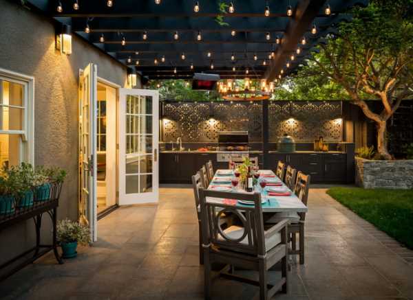 Другой важный акцент – наружное освещение, которое особенно важно в вечернее время. При этом его можно привязать к общей системе освещения на участке либо сделать индивидуальным, чтобы при необходимости варьировать согласно обстановке и количеству присутствующих людей. Важно обратить внимание и на качество используемых осветительных приборов. Они должны соответствовать стандарту наружного освещения относительно устойчивости к влаге и пыли. В противном случае на длительную эксплуатацию рассчитывать не придется.