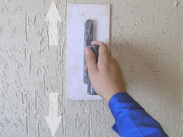 При помощи пластиковой терки следует затирать поверхность штукатурки с большей степенью нажима до достижения желаемого результата. В данном случае зерно, находящееся в растворе зажатое между плоскостью терки и стены, будет прокладывать себе дорогу в застывшем слое штукатурки, образуя при этом причудливую фактуру. На данном этапе формирования фактуры штукатурка не должна липнуть к плоскости терки. Если же налипание все же наблюдается необходимо выждать еще немного времени до тех пор, пока не произойдет полимеризация раствора до нужной степени. Перед началом второго прохода в обязательном порядке необходимо очистить терку от остатков штукатурки. Не стоит слишком усердно затирать штукатурку, поскольку, чем больше проходов теркой будет совершено, тем более гладкой станет поверхность. Важно добиться такого результата, при котором рисунок фактуры будет отчетлив и равномерно распределен по всей плоскости.