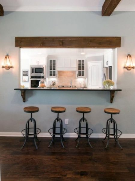 Второй вариант проема между кухней и гостиной чаще именуют барным. Подоконник подобного окна играет роль барной стойки. Функциональное окно предпочтительно, если члены семьи любят трапезничать в гостиной. Барное окно позволяет упростить сервировку стола, так как не придется бегать из одного помещения в другое с тарелками в руках.