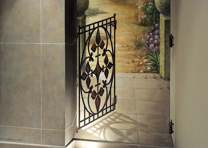 Около двери нарисована арка, ведущая в дали, сквозь цветущий сад.